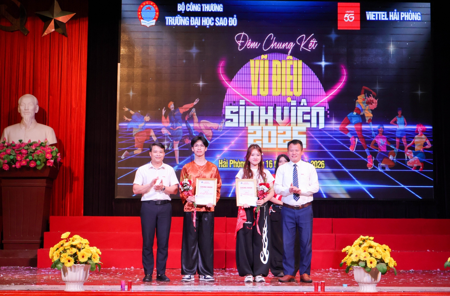 ThS. Trần Quốc Chiến – Trọng tài Quốc tế bộ môn khiêu vũ, Trưởng Ban giám khảo và TS. Phạm Văn Dự - Trưởng phòng Công tác sinh viên, Phó Ban tổ chức trao giải Ba cho các đội