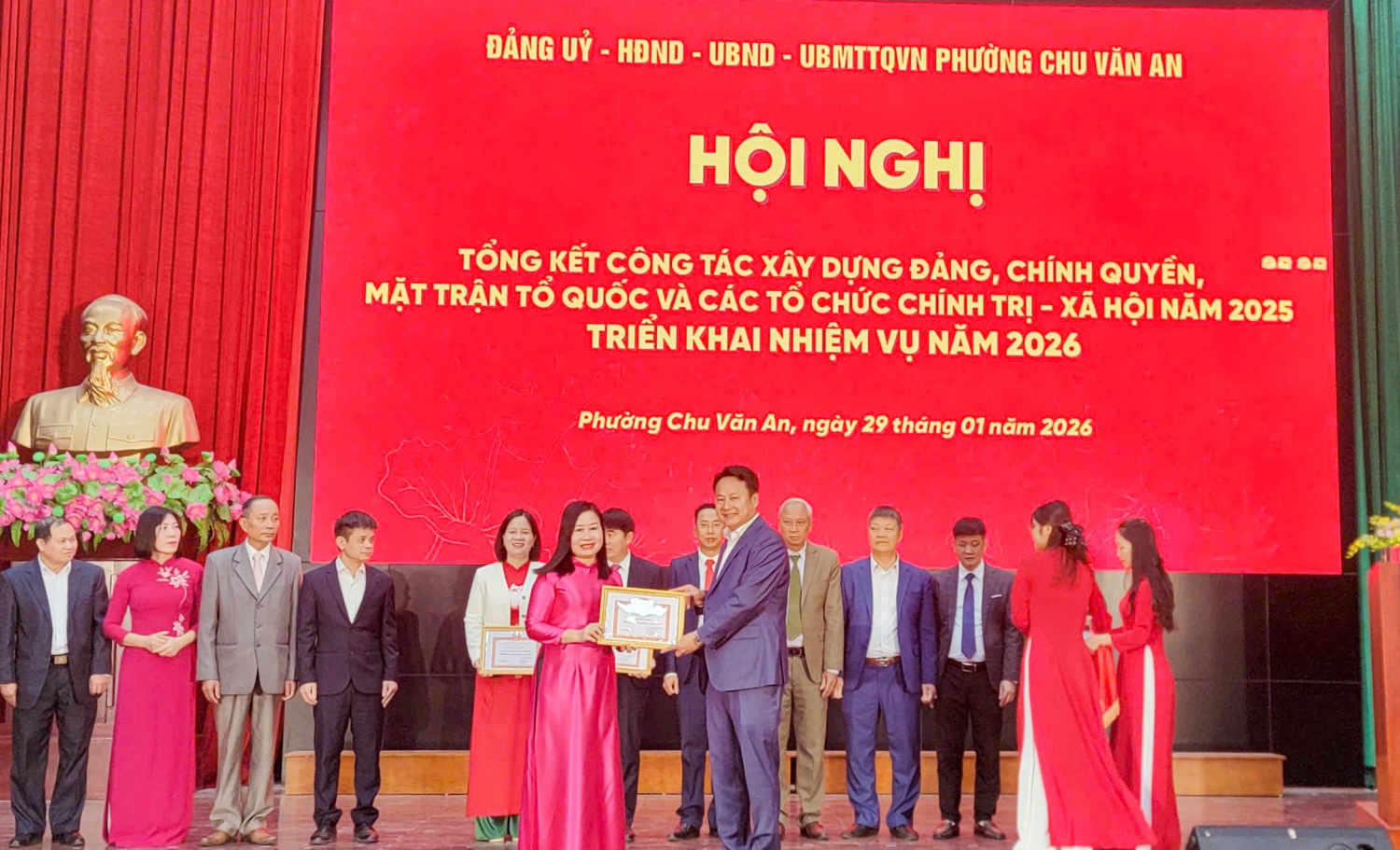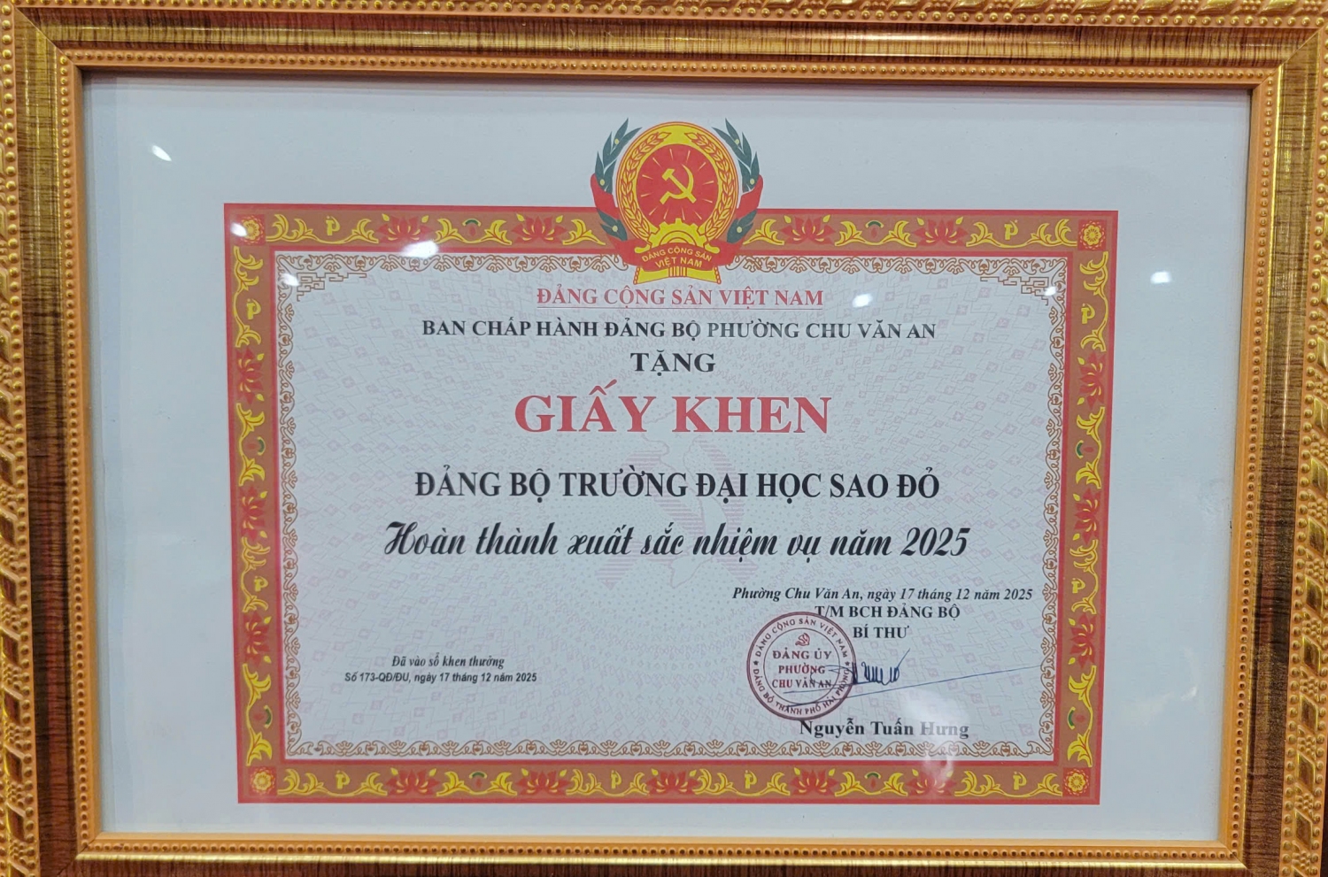 Ghi nhận những đóng góp tích cực đó, Đảng bộ Nhà trường đã được Đảng ủy phường Chu Văn An trao Giấy khen “Hoàn thành xuất sắc nhiệm vụ năm 2025”. Thay mặt, Đảng bộ NGƯT. TS. Nguyễn Thị Kim Nguyên, Bí thư Đảng ủy, Hiệu trưởng nhận Giấy khen “Đảng bộ Trường Đại học Sao Đỏ hoàn thành xuất sắc nhiệm vụ năm 2025”.