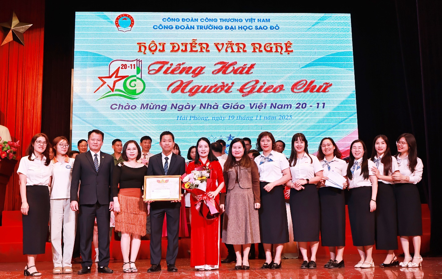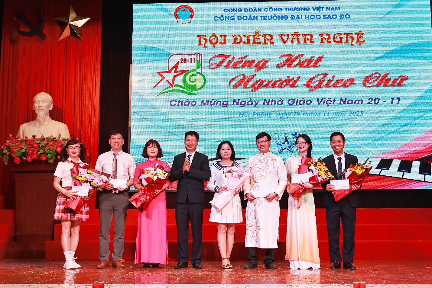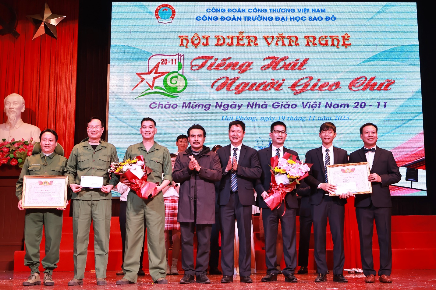 Phát biểu khai mạc, đồng chí Cao Văn Biên – Chủ tịch Công đoàn trường nhấn mạnh: Hội diễn văn nghệ: “Tiếng hát người gieo chữ” được tổ chức nhằm tạo nên không khí vui tươi, phấn khởi, tràn đầy tự hào về mái trường có 56 năm truyền thống đào tạo, đồng thời là sự kiện chào mừng kỷ niệm 43 năm ngày Nhà giáo Việt Nam (20/11/1982 – 20/11/2025). Hội diễn có sự hội tụ của toàn thể viên chức giảng viên và sinh viên Nhà trường. Những lời ca, tiếng hát trong đêm diễn không chỉ thể hiện lòng tự hào, lòng yêu nghề của viên chức giảng viên mà còn thay cho những lời tri ân sâu sắc nhất của các thế hệ sinh viên gửi đến các thầy giáo, cô giáo, những người đang ngày đêm, miệt mài, lặng lẽ chở chuyến đò tri thức cập bến thành công”.