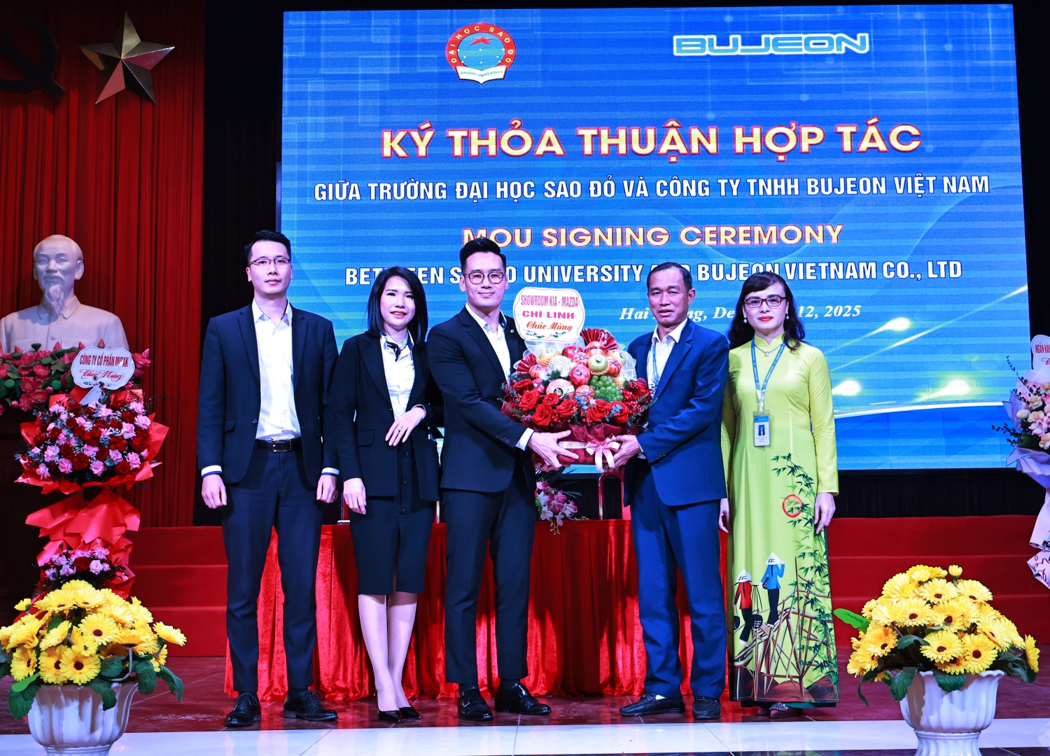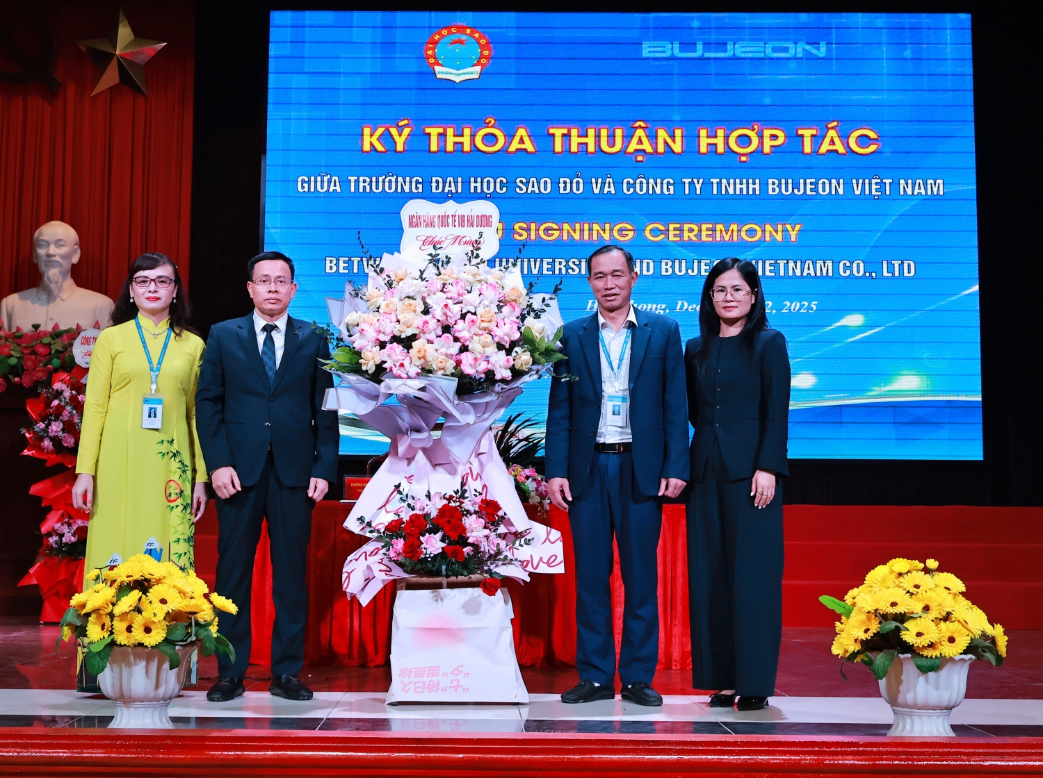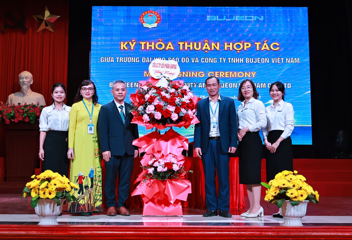 Đại diện công ty TNHH Bujeon Vietnam Electronics tặng hoa chúc mừng