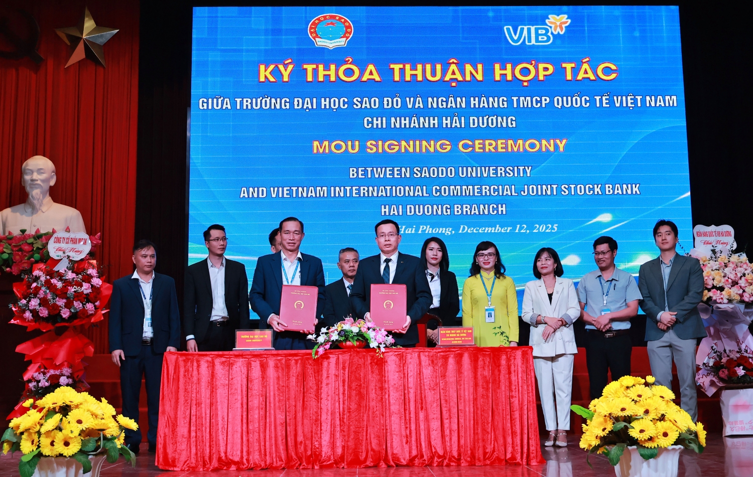 Đại diện Ngân hàng Thương mại cổ phần Quốc tế Việt Nam chi nhánh Hải Dương tặng hoa chúc mừng