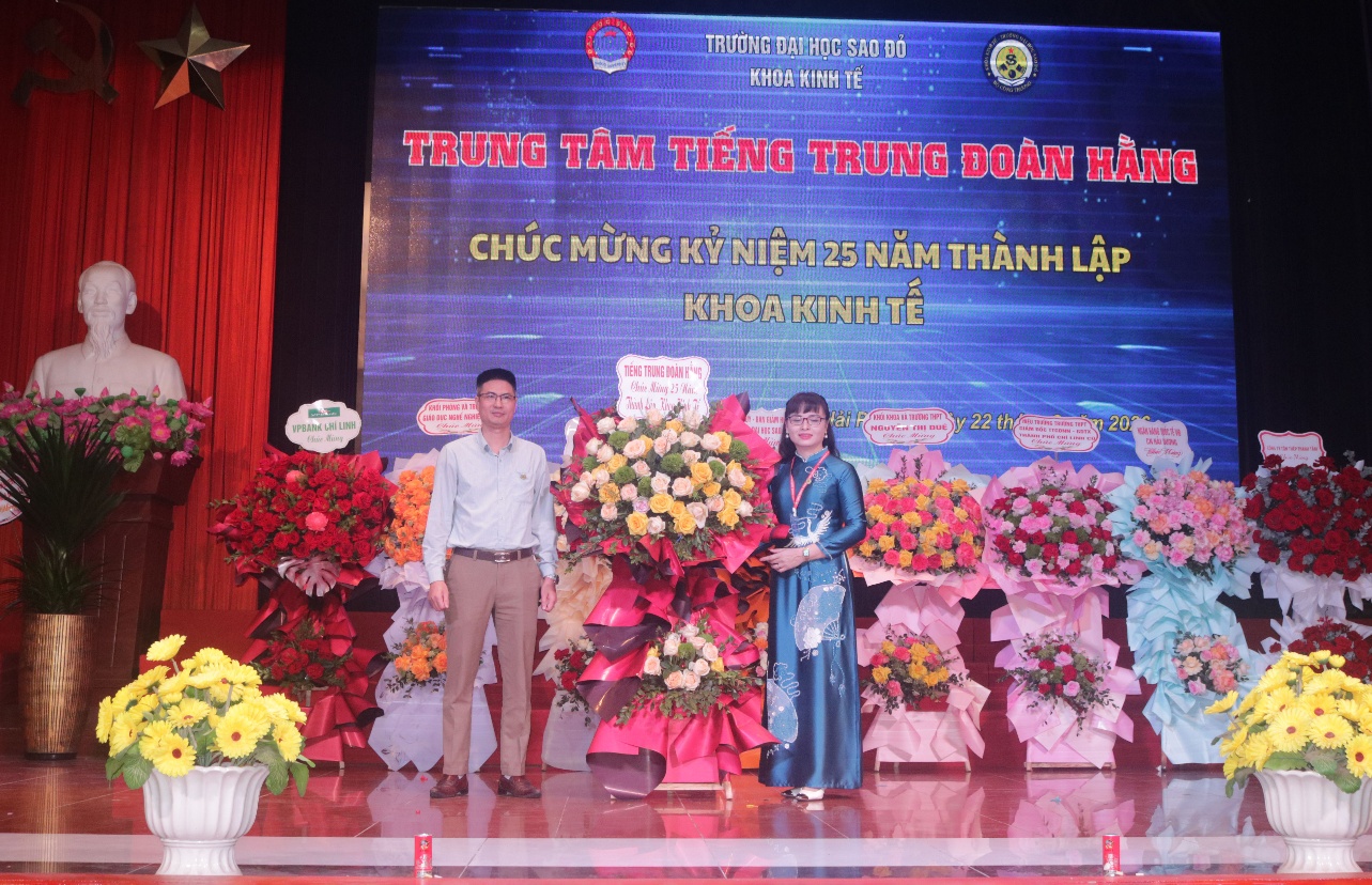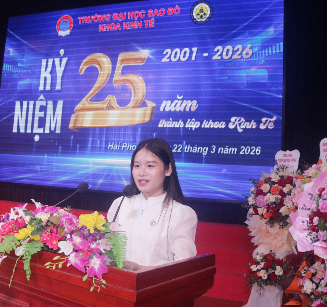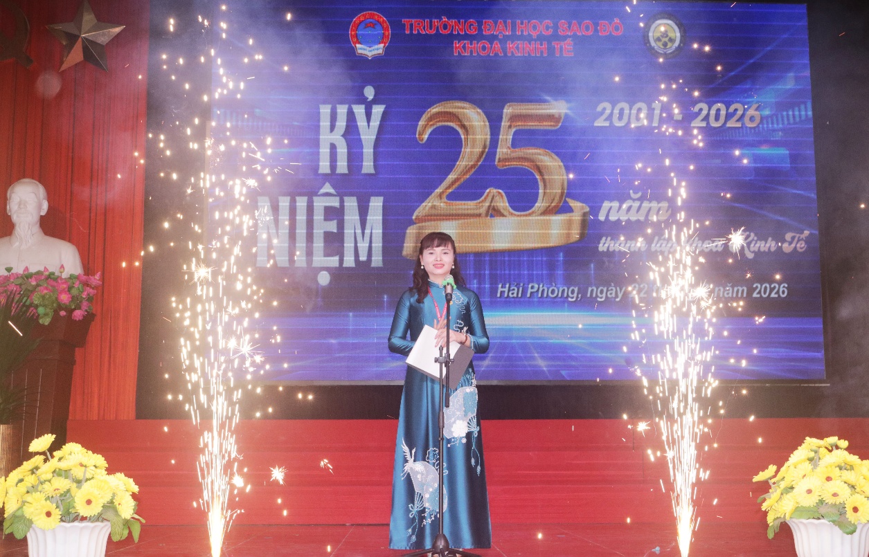 Phát biểu tại buổi lễ, TS. Phạm Thị Hồng Hoa - Trưởng khoa kinh tế đã ôn lại chặng đường 25 năm xây dựng và phát triển của Khoa Kinh tế - Trường Đại học Sao Đỏ. Sau 25 năm, từ một đơn vị đào tạo quy mô nhỏ, Khoa đã phát triển thành đơn vị có nhiều ngành học đáp ứng xu hướng phát triển kinh tế - xã hội hiện đại; đa dạng hóa các loại hình đào tạo, tạo điều kiện thuận lợi cho nhiều đối tượng người học. Điểm nhấn lớn trên hành trình 25 năm qua chính là sự trưởng thành của các thế hệ sinh viên, những người đã và đang đóng góp tích cực vào hoạt động của doanh nghiệp, cơ quan, tổ chức trong và ngoài nước, minh chứng cho chất lượng đào tạo cũng như uy tín của Khoa Kinh tế. Bên cạnh đó, Khoa luôn chú trọng xây dựng đội ngũ giảng viên, đẩy mạnh nghiên cứu khoa học, đổi mới phương pháp giảng dạy, hợp tác doanh nghiệp, hoàn thiện chương trình theo định hướng hội nhập và chuyển đổi số, gắn kết đào tạo với thực tiễn, nâng cao năng lực nghề nghiệp cho sinh viên.