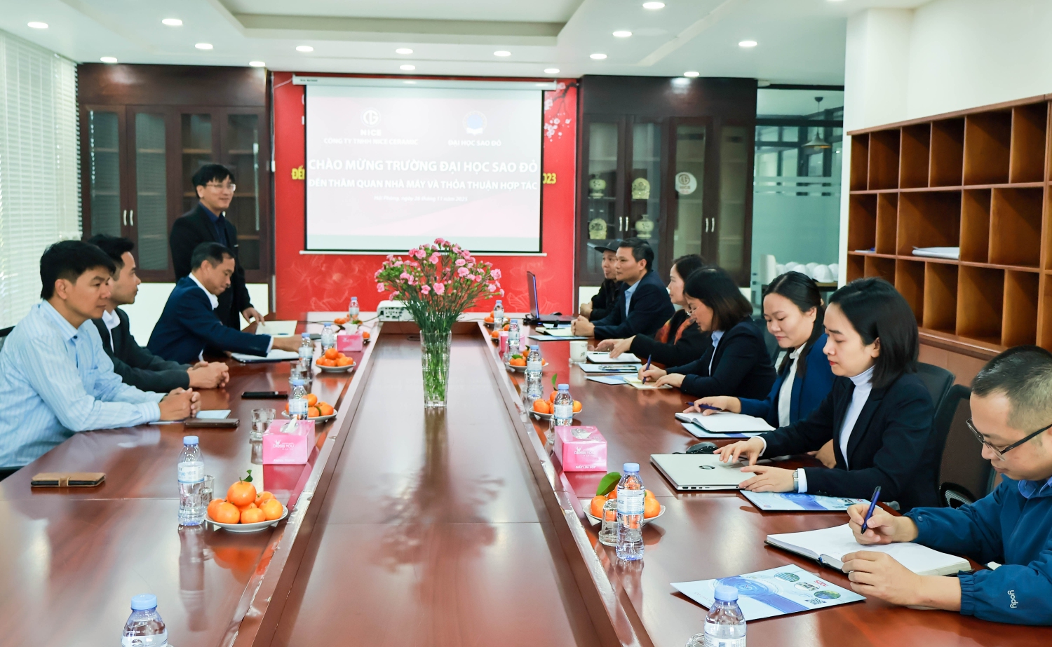 Tại buổi làm việc, TS. Đỗ Văn Đỉnh - Phó Hiệu trưởng Nhà trường đã giới thiệu tổng quan về Trường Đại học Sao Đỏ: Quy mô đào tạo, các ngành đào tạo, đội ngũ giảng viên. Đặc biệt nhấn mạnh đến việc tăng cường hợp tác đào tạo, xúc tiến việc làm cho sinh viên sau khi tốt nghiệp. Nhà trường có thể đáp ứng tốt nhu cầu tuyển dụng của Công ty. Tại buổi làm việc, Nhà trường mong muốn Công ty sẽ tạo điều kiện tiếp nhận sinh viên về trải nghiệm thực tế, thực tập và làm việc. Đồng thời, phối hợp với Nhà trường trong đào tạo, chuyển giao công nghệ để đạt được hiệu quả cao.