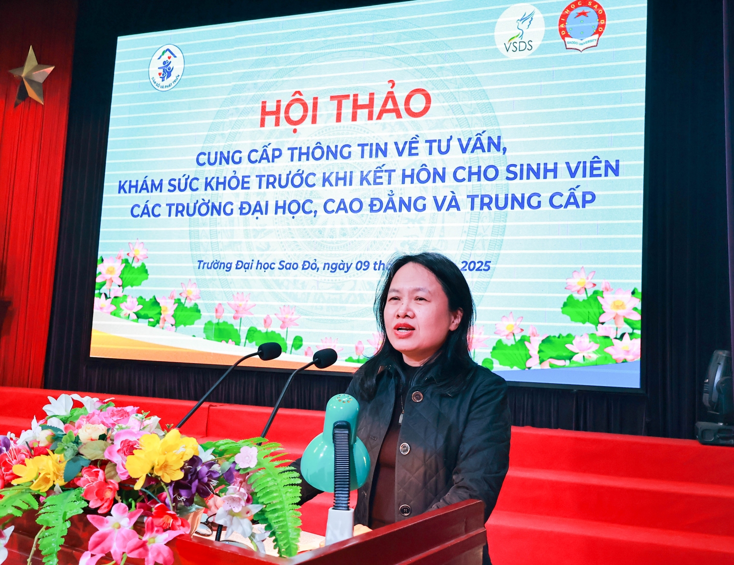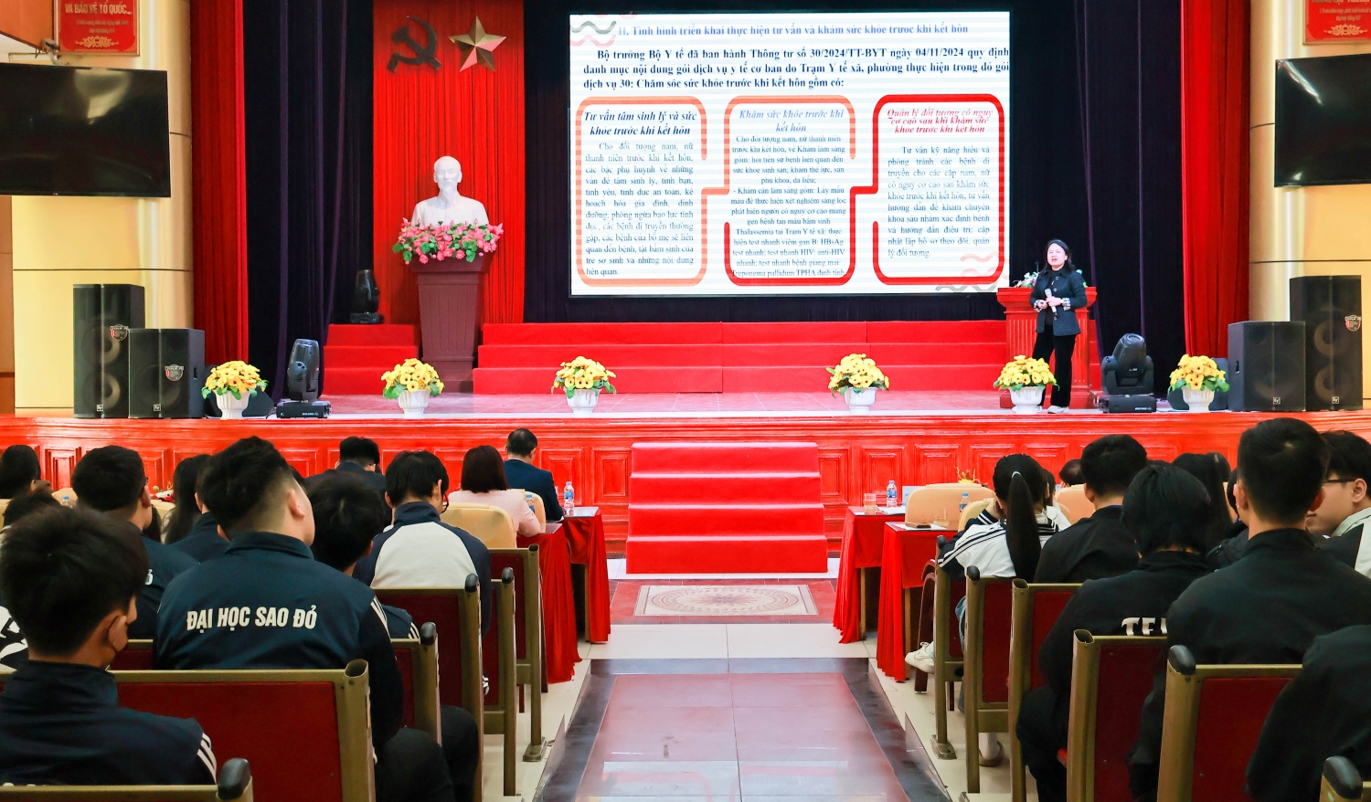 Phát biểu tại Hội thảo TS. Đỗ Văn Đỉnh – Phó Bí thư Đảng ủy, Phó Hiệu trưởng Nhà trường cho biết: “Trường Đại học Sao Đỏ luôn coi trọng việc giáo dục toàn diện bao gồm những kiến thức chuyên môn, kỹ năng sống, sức khỏe cần thiết cho sinh viên. Nhà trường vinh dự được Trung ương Hội Sinh viên Việt Nam và Bộ Y tế lựa chọn là địa điểm để tổ chức Hội thảo “Cung cấp thông tin về tư vấn và khám sức khoẻ trước khi kết hôn dành cho sinh viên các trường đại học, cao đẳng và trung cấp”. Với sự góp mặt của PGS. TS. BS. Trần Đức Phấn – Một diễn giả hàng đầu trong lĩnh vực tư vấn, khám sức khỏe trước khi kết hôn sẽ mang đến hội thảo những thông tin khoa học, hữu ích và thiết thực cho sinh viên Nhà trường. Qua đó giúp sinh viên Nhà trường nâng cao ý thức, sống trách nhiệm, có văn hóa ứng xử văn minh trước khi xây một gia đình hạnh phúc bền vững trong tương lai”.