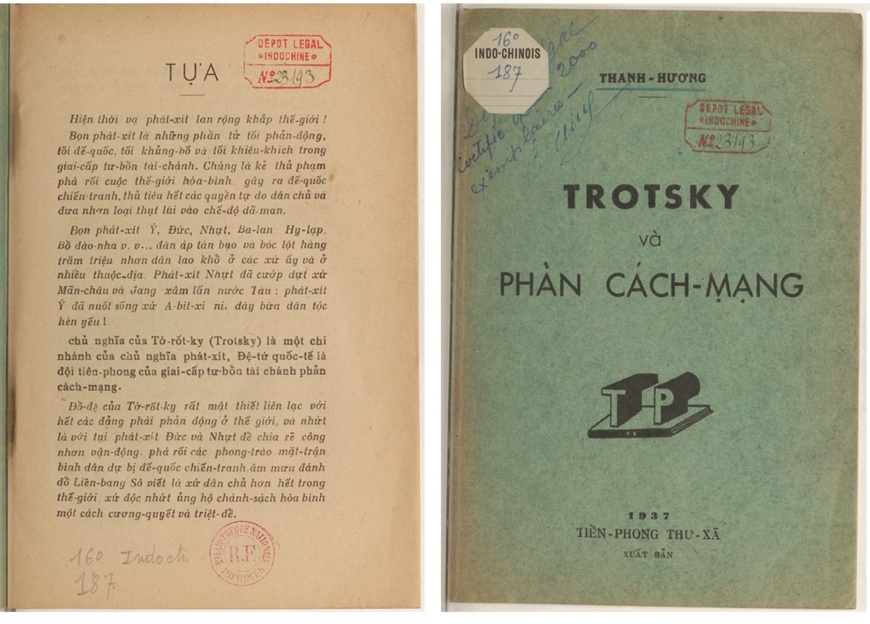 Bìa cuốn sách "Trotsky và phản cách mạng" của đồng chí Hà Huy Tập viết mang bút danh Thanh Hương (1937)