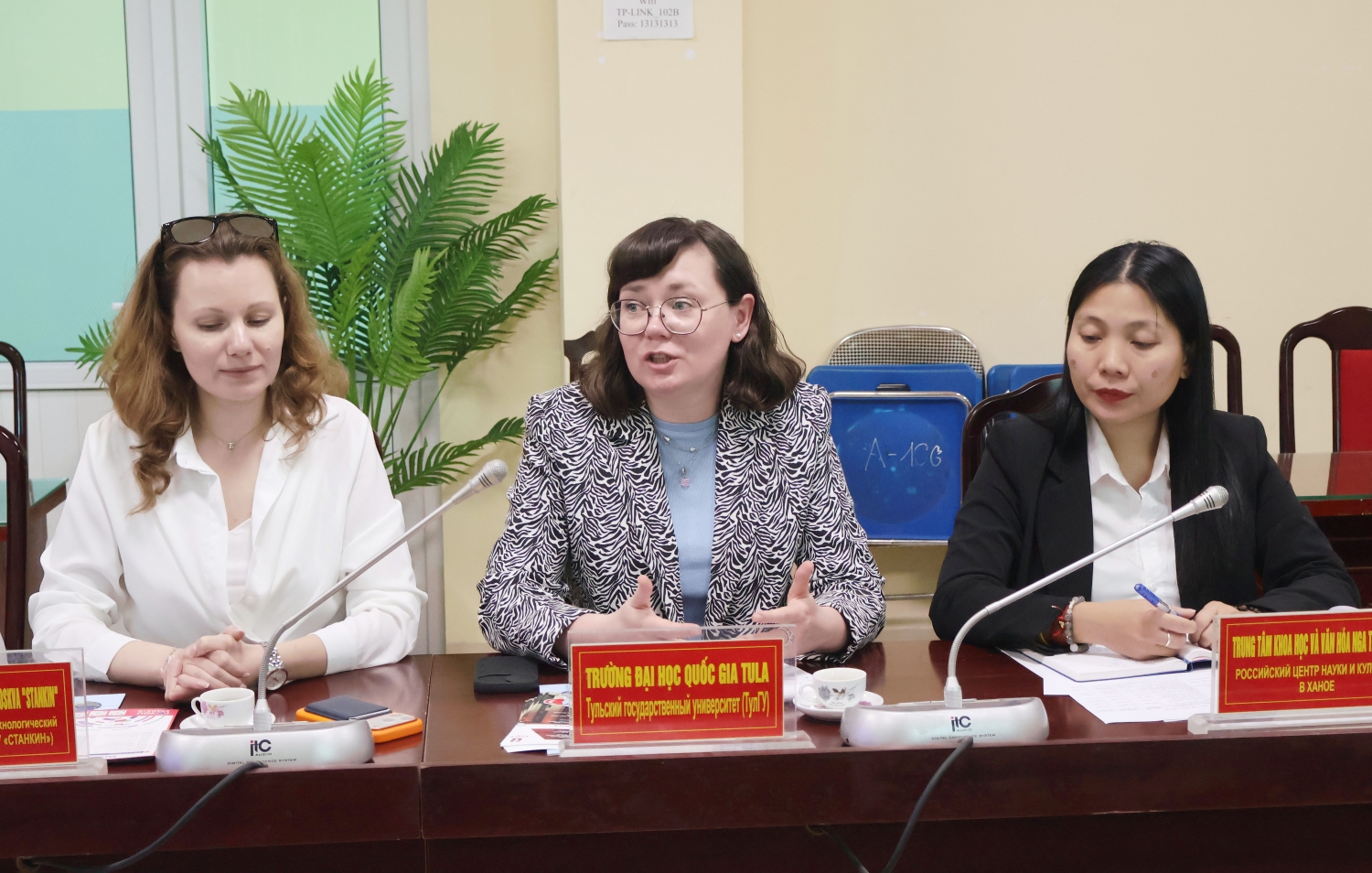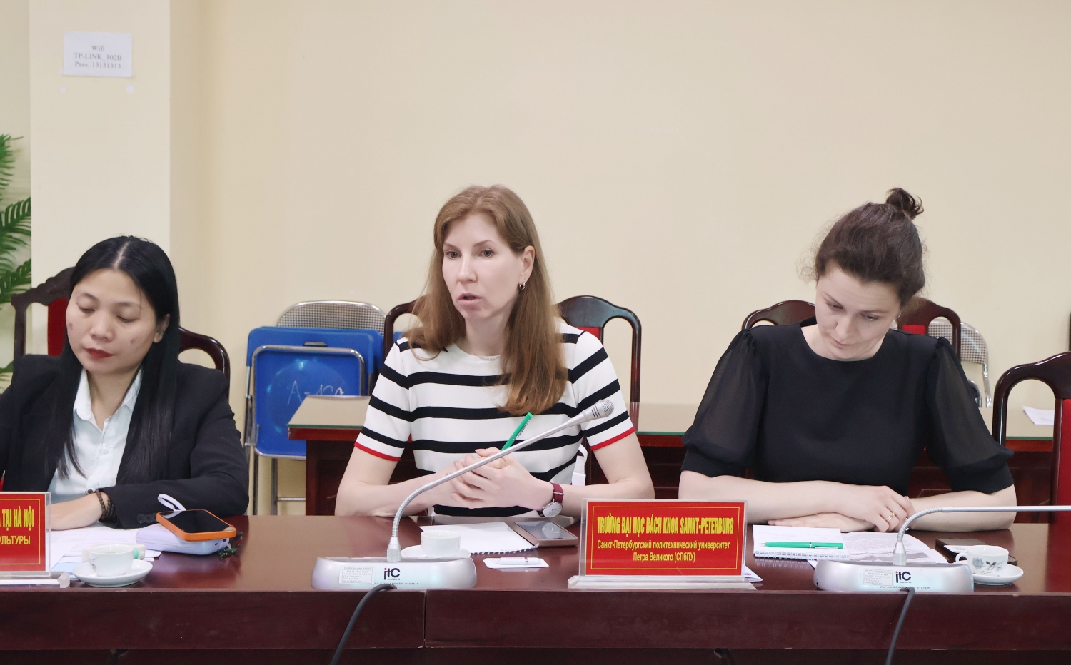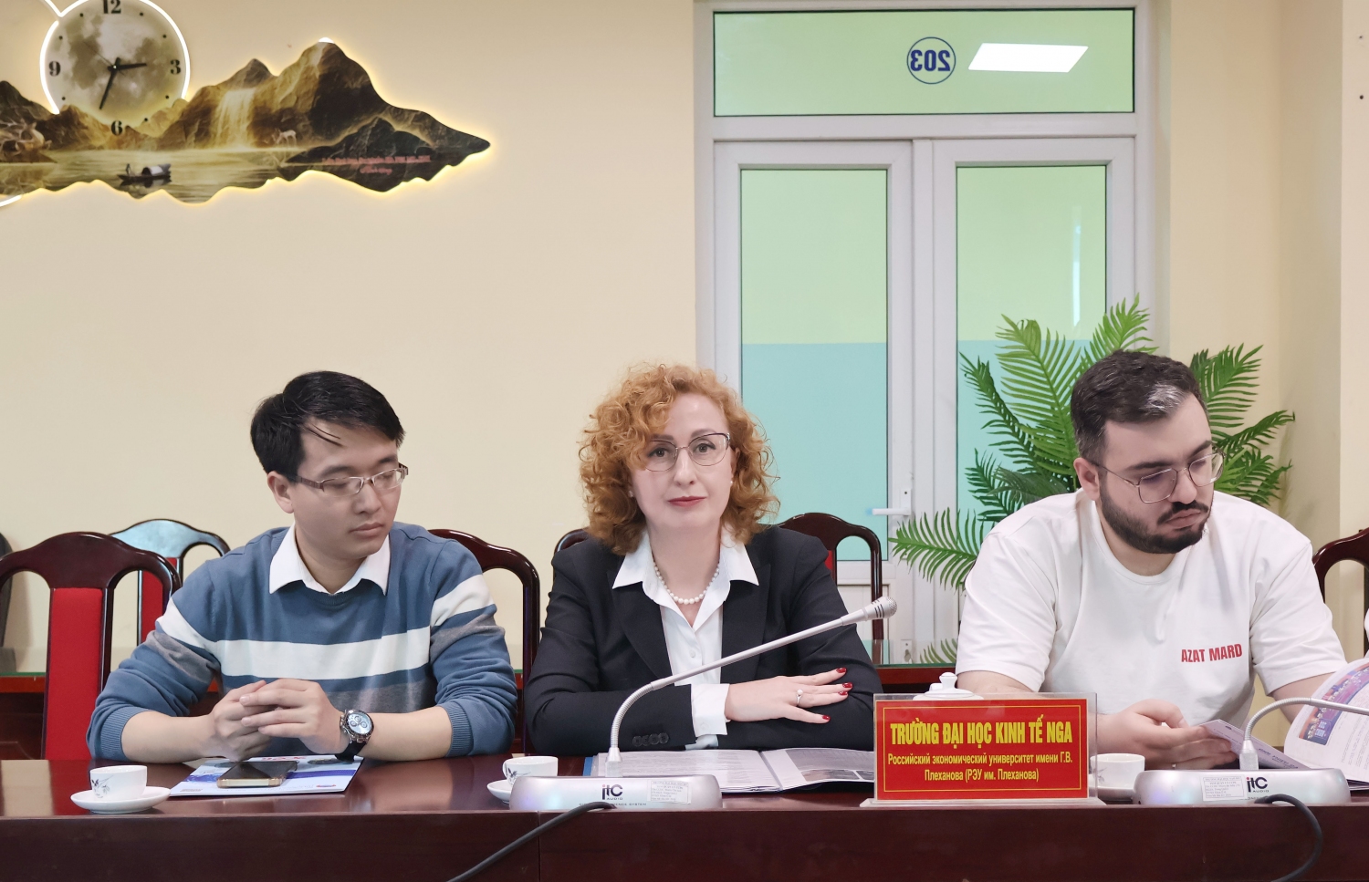 Tham dự buổi làm việc về phía đoàn đại biểu có Bà Petrova Galina Leonidovna – Giám đốc Trung tâm giáo dục “Khoa Dự bị dành cho công dân nước ngoài”, Trường Đại học Ngôn ngữ Quốc gia Nizhny Novgorod; Bà Menshikova Natalia Alexandrovna – Tiến sĩ khoa học xã hội, Phó trưởng phòng các nước khu vực Châu Á – Thái Bình Dương, Trường Đại học Kinh tế Nga; Bà Popova Ksenia Alekseevna – Phó Giám đốc Trung tâm Sinh viên quốc tế, thuộc phòng Hợp tác quốc tế, Trường Đại học Công nghệ Quốc gia Moskva “Stankin”; Bà Gladkova Olga Dmitrievna – Tiến sĩ khoa học sư phạm, Giám đốc Viện Giáo dục quốc tế, Trường Đại học Quốc gia Tula; Bà Ermolenko Svetlana Vladimirovna - Tiến sĩ khoa học ngữ văn, PGS bộ môn tiếng Anh, nghiên cứu viên cao cấp Trung tâm nghiên cứu Đọc, Trường Đại học Quốc gia Tomsk; Bà Bocharova Maria Ilyinichna – Giám đốc Trung tâm Tuyển sinh và Truyền thông quốc tế, thuộc Ban Giáo dục quốc tế, Trường Đại học Bách khoa Sankt-Peterburg.