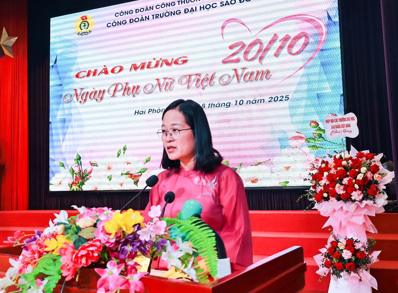 Ôn lại lịch sử truyền thống ngày thành lập Hội Liên hiệp Phụ nữ Việt Nam, TS. Hoàng Thị Hòa – Trưởng Ban nữ công khẳng định: “95 năm hình thành và phát triển, Hội Liên Hiệp phụ nữ Việt Nam ngày càng lớn mạnh. Người phụ nữ Việt Nam ngày càng có tri thức, sức khỏe, năng động, sáng tạo và có lối sống văn hóa, lòng nhân hậu, vị tha xứng đáng với 8 chữ vàng Bác Hồ tặng: “Cần cù, Bất khuất, Trung hậu, Đảm đang”. Phát huy truyền thống đó, trong năm qua, nữ cán bộ viên chức Trường Đại học Sao Đỏ đã và đang đóng góp mạnh mẽ vào công cuộc xây dựng, đổi mới và phát triển Nhà trường. Nhiều chị em đã tích cực học tập nâng cao trình độ chuyên môn, lý luận chính trị, ứng dụng khoa học công nghệ mới vào giảng dạy, tham gia các phong trào: Phục vụ tốt – Giảng dạy tốt, phong trào “Sáng tạo khoa học công nghệ”.  Không chỉ giỏi việc trường mà các chị còn đảm việc nhà, nuôi dạy các con đạt thành tích cao trong học tập: Hơn 100 chị có con đạt danh hiệu học sinh giỏi các cấp (có 02 chị có con đạt giải học sinh giỏi Quốc gia, 24 chị có con đạt giải học sinh giỏi cấp Tỉnh; 28 chị có con đạt giải cấp Thành phố). Trong hơn 200 cháu là con cán bộ viên chức được khen thưởng năm học 2024-2025 của Nhà trường có một phần công lao của các chị em. Bên cạnh đó nhiều chị em luôn tích cực tham gia vào các hoạt động phong trào do Công đoàn Trường tổ chức như: Phong trào bảo vệ môi trường xanh - sạch - đẹp; phong trào thể dục - thể thao; phong trào tình nguyện, thiện nguyện...