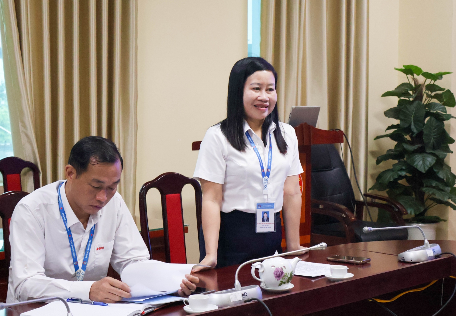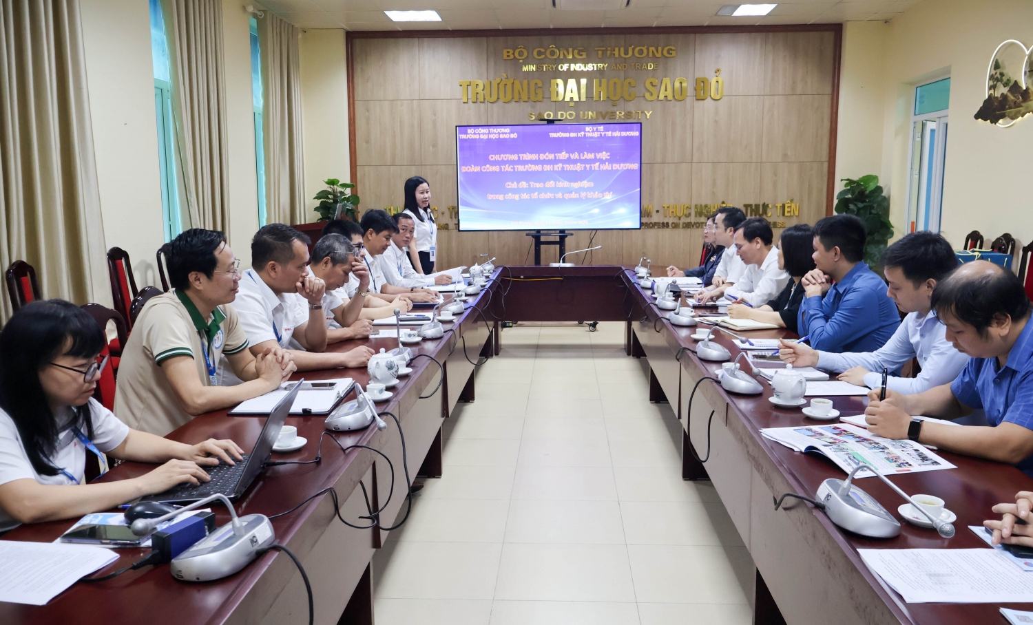 Tại buổi làm việc TS. BS. Phạm Thị Cẩm Hưng – Hiệu trưởng Trường Đại học Kỹ thuật Y tế Hải Dương cùng trao đổi với lãnh đạo Trường Đại học Sao Đỏ về việc tham quan thực tiễn việc triển khai hệ thống thi trên máy tính của Trường Đại học Sao Đỏ – đơn vị đã có kinh nghiệm trong việc phối hợp tổ chức thi đánh giá năng lực (HSA) của Đại học Quốc gia Hà Nội và tổ chức thi đánh giá tư duy (TSA) của Đại học Bách khoa Hà Nội. Đồng thời tìm hiểu các nội dung liên quan đến tổ chức thi trên máy tính, bao gồm: Thiết kế hạ tầng phòng thi, cấu hình thiết bị phần cứng, giải pháp mạng nội bộ; ứng dụng phần mềm quản lý và tổ chức thi; quy trình vận hành, giám sát an ninh và xử lý sự cố kỹ thuật.