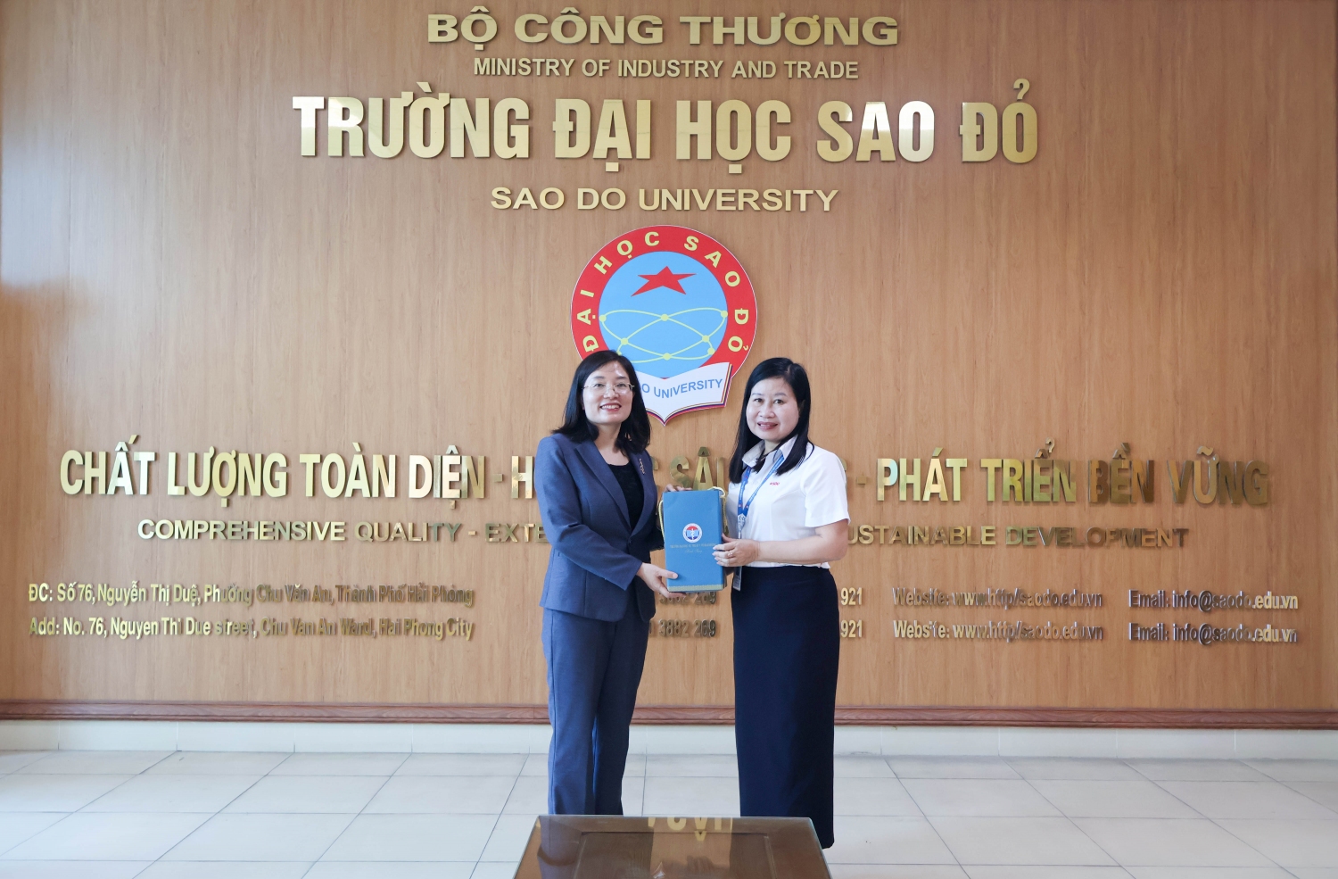 TS.BS. Phạm Thị Cẩm Hưng – Hiệu trưởng Trường Đại học Kỹ thuật Y tế Hải Dương tặng quà lưu niệm